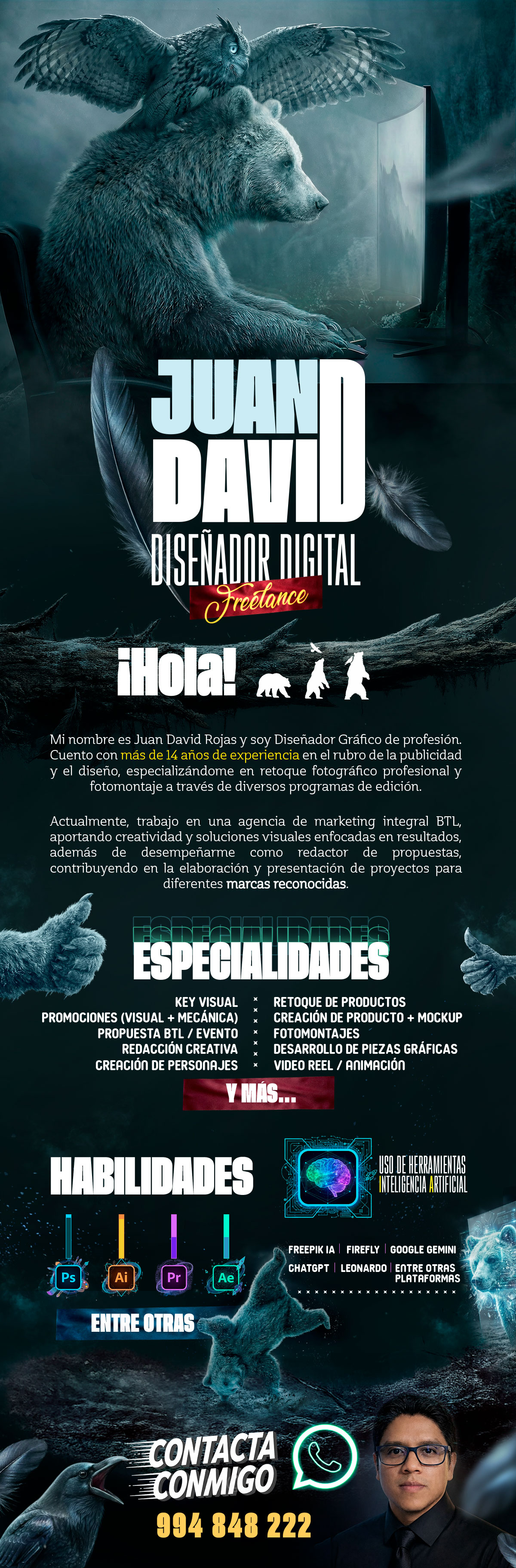 Cuento con más de 14 años de experiencia en diseño, desarrollando key visuals, campañas promocionales, retoque fotográfico y piezas POP,etc, incorporando además diversas herramientas de inteligencia artificial en mis procesos creativos.